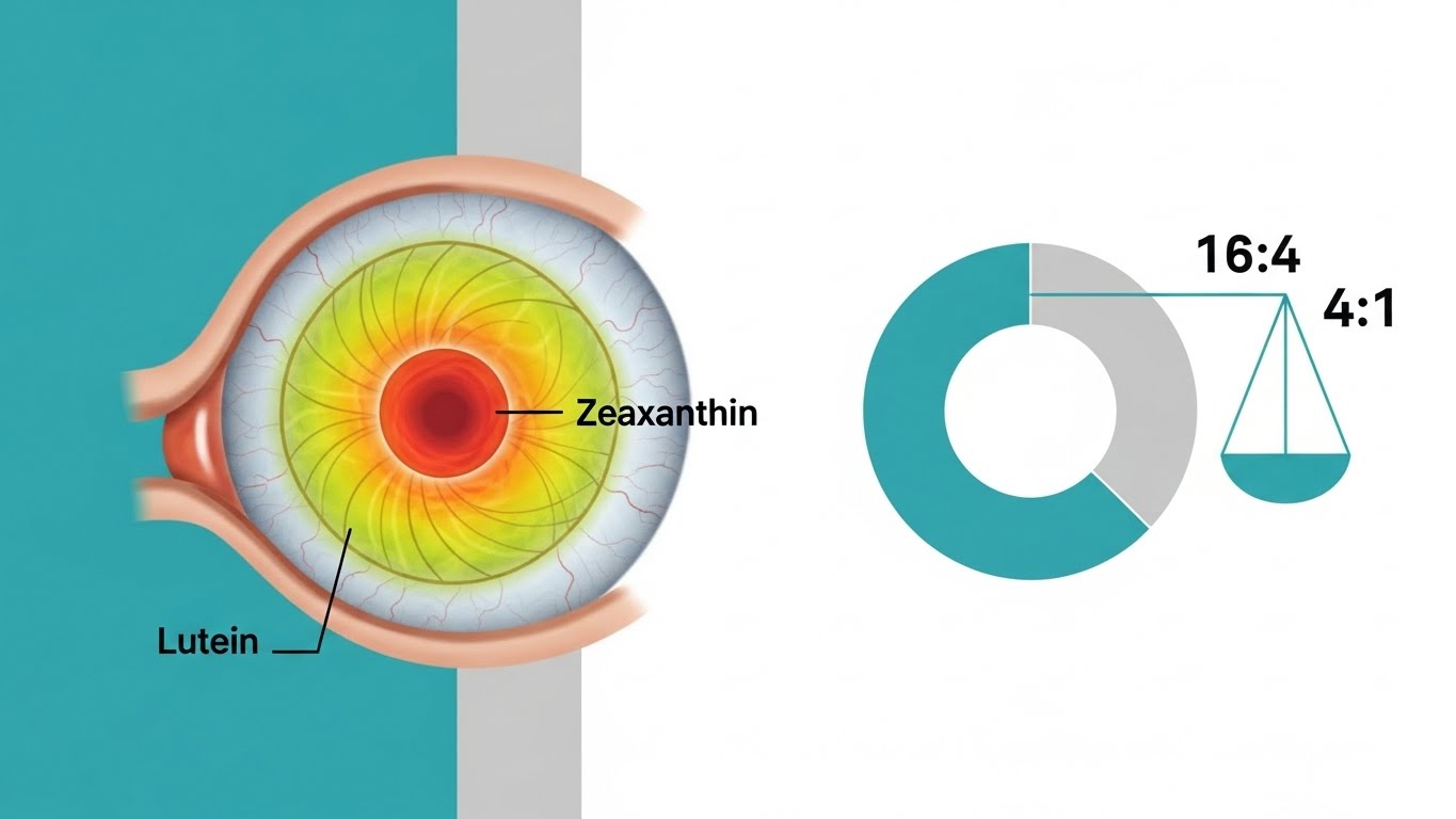 - 체내 비율 16:4: 건강한 성인의 혈중 루테인과 지아잔틴 농도 비율을 분석해 보면 약 4:1~5:1 정도를 유지합니다. 이를 제품화했을 때 가장 이상적인 배합인 루테인 16mg : 지아잔틴 4mg (총 20mg) 비율로 섭취할 때 흡수율과 생체 이용률이 가장 높다고 알려져 있습니다.