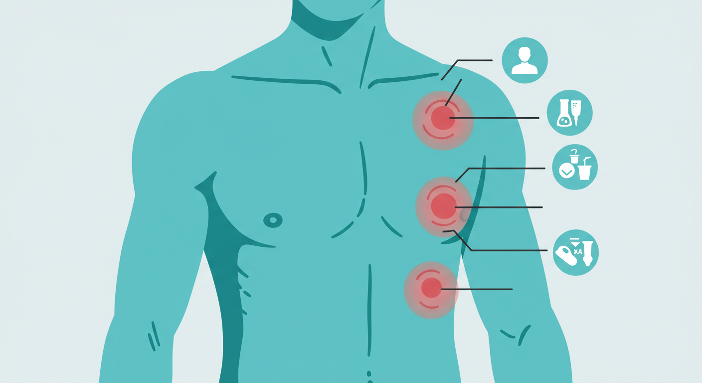 위산이 식도로 역류하면서 식도 점막에 염증을 일으키는 '역류성 식도염'도 흔한 원인 중 하나입니다. 위산이 가슴 부위의 식도를 자극하면서 타는 듯한 통증이나 뻐근함을 유발하는데, 이것이 오른쪽 가슴 통증처럼 느껴질 수 있어요.