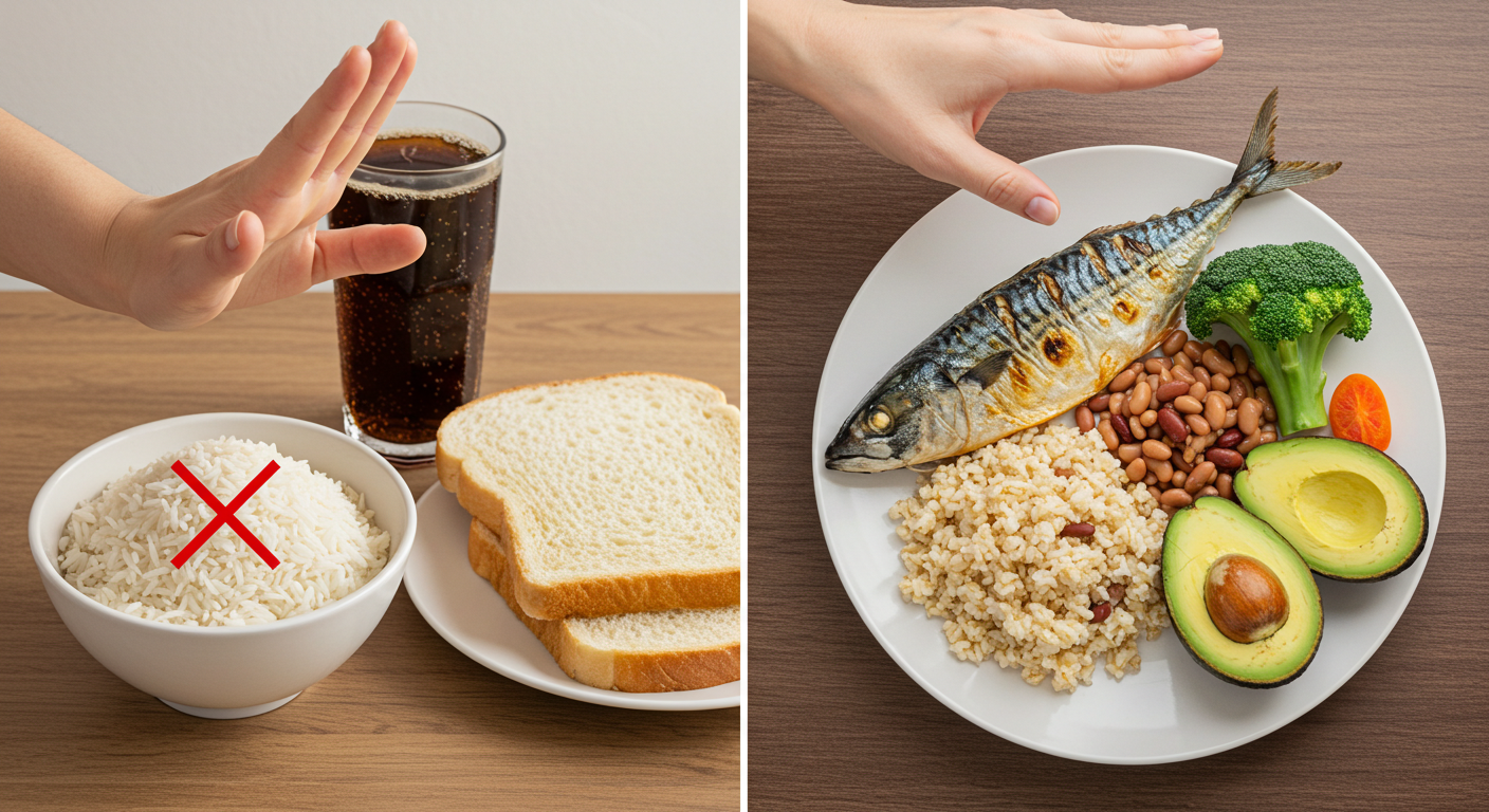 - '정제 탄수화물' 섭취 줄이기: 가장 중요하고 효과적인 방법입니다. 흰쌀밥, 빵, 면, 떡, 과자 섭취를 줄이는 것만으로도 수치는 눈에 띄게 좋아집니다. 밥을 지을 때 현미나 귀리, 콩 등 잡곡의 비율을 높여보세요.