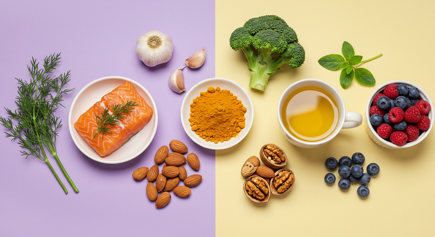 - 항염증 효과: 등푸른생선, 마늘, 양파, 강황처럼 염증을 줄이는 음식을 꾸준히 섭취하세요.